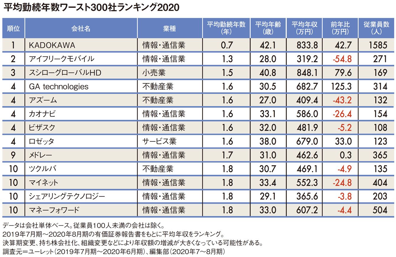 「1位は0.7年」平均勤続年数ワースト300社ランキング2020
