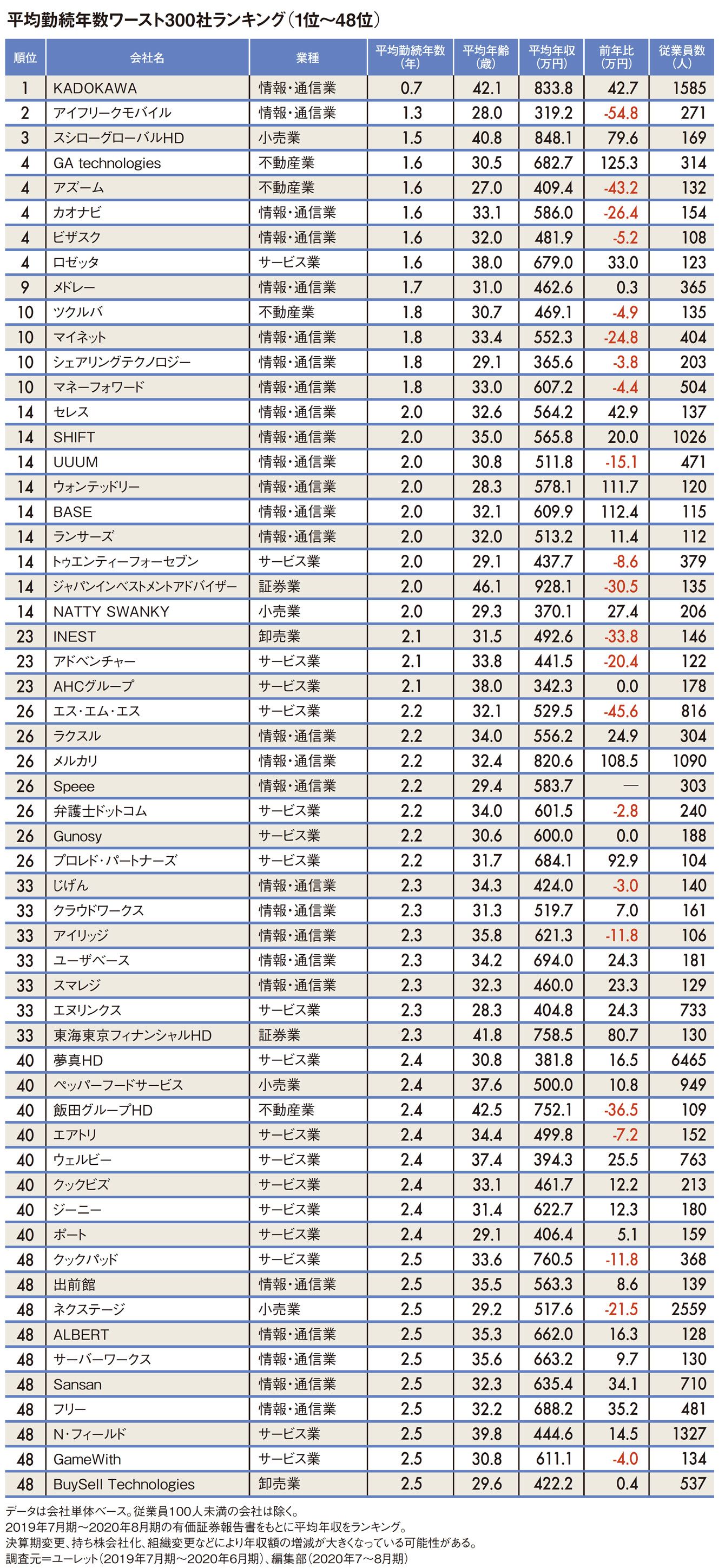 「1位は0.7年」平均勤続年数ワースト300社ランキング2020