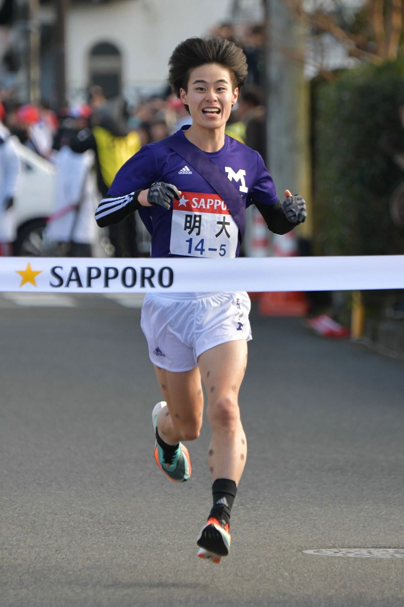 往路を5位でゴールする明治大の鈴木聖人=2020年1月2日、神奈川県箱根町(写真=時事通信フォト)