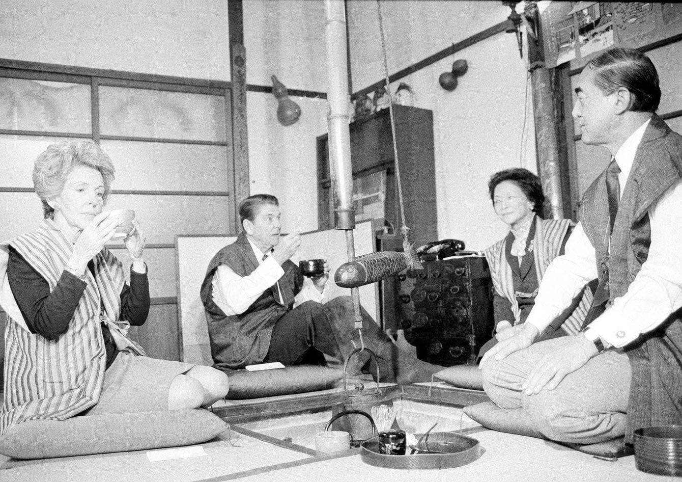 中曽根康弘首相(当時、以下同。右端)が別荘として所有していた日の出山荘に招かれ、茶を楽しむロナルド・レーガン米大統領(左から2人目)=1983年11月11日