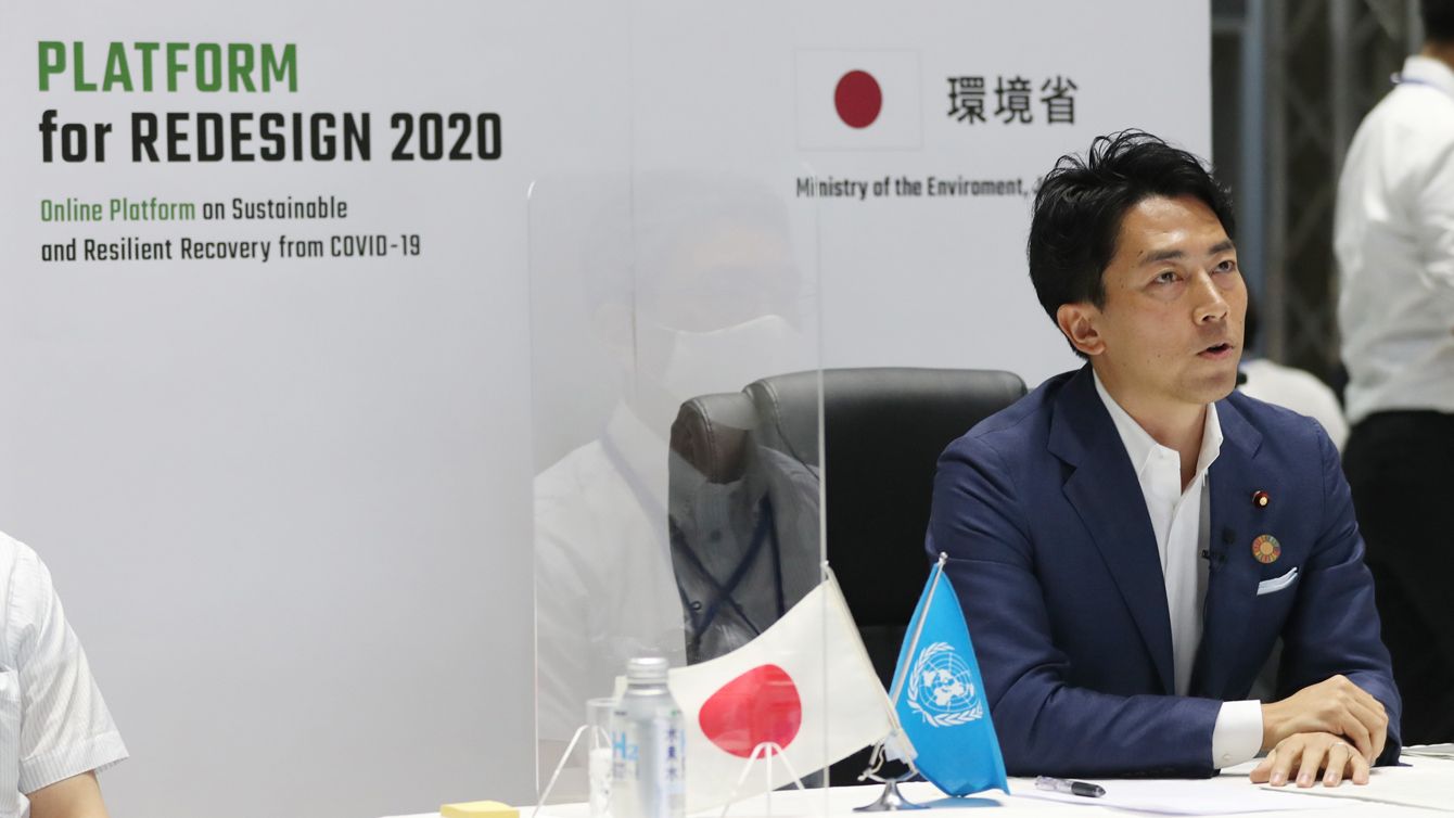 新型コロナウイルスからの復興と気候変動・環境対策に関する各国環境相らとのオンライン会議で、議長を務める小泉進次郎環境相=2020年9月3日、東京都港区