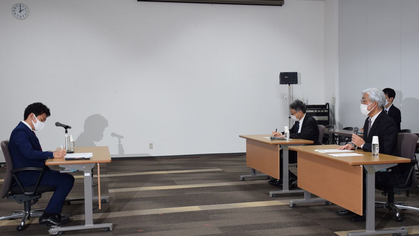 宮下宗一郎むつ市長(左)に使用済み核燃料の中間貯蔵施設共同利用案について説明する電気事業連合会の清水成信副会長(右)=2020年12月18日、青森県むつ市役所