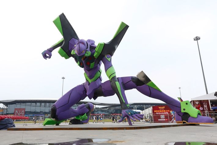 最初のTVアニメ放映から25年を経た今も、傑作アニメ『エヴァンゲリオン』シリーズは多くの人々を惹きつけ続けている。2016年に上海で開かれた大規模ゲームイベント「チャイナジョイ2016」にて、会場内に設置されたエヴァ初号機の巨大像=2016年7月29日