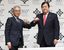 記者会見後、写真に納まる三井物産の堀健一次期社長(左)と安永竜夫社長=2020年12月23日、東京・大手町