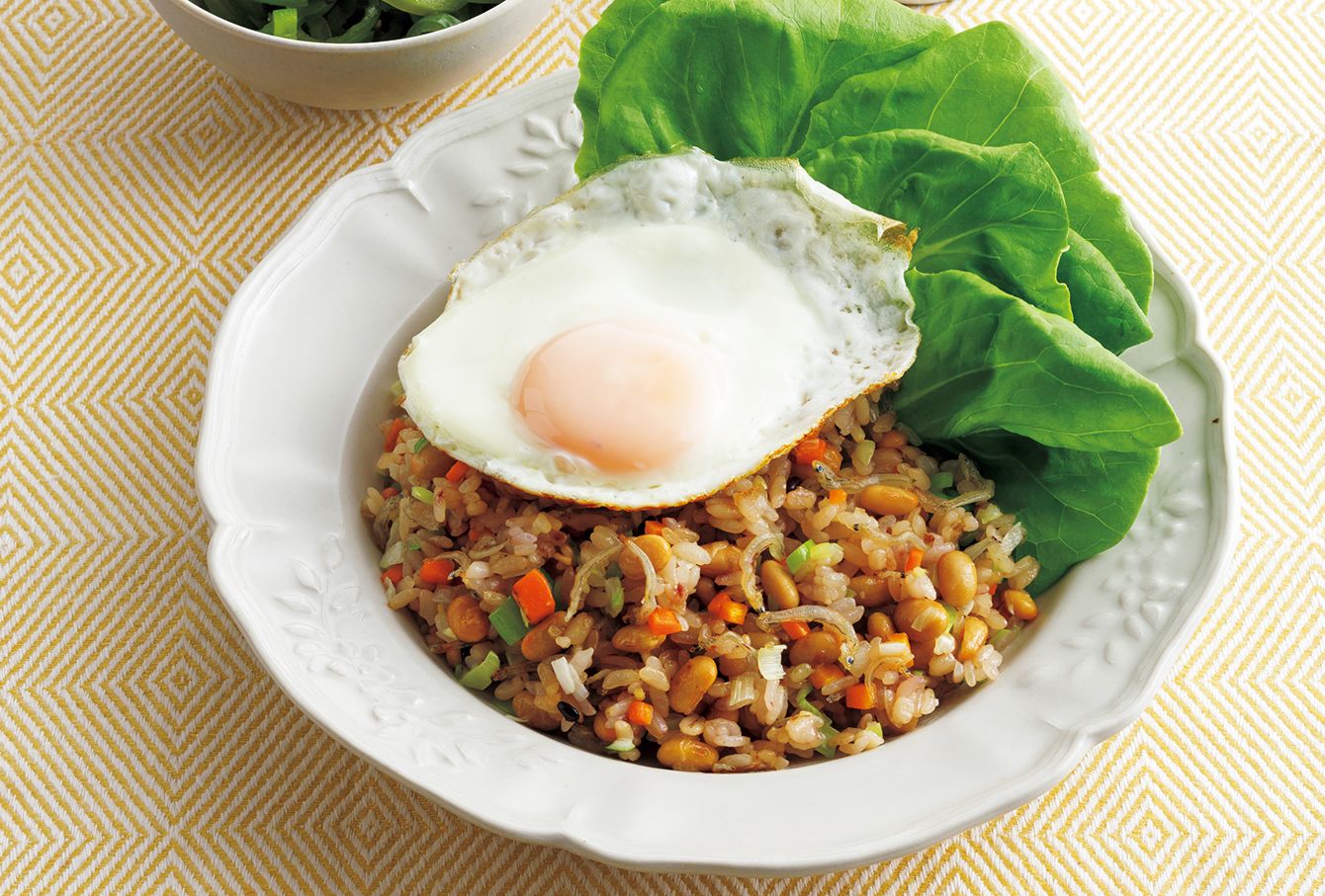 具沢山のチャーハン。さらにサラダ菜など生野菜を添えて、巻いてたべるのもおすすめ。