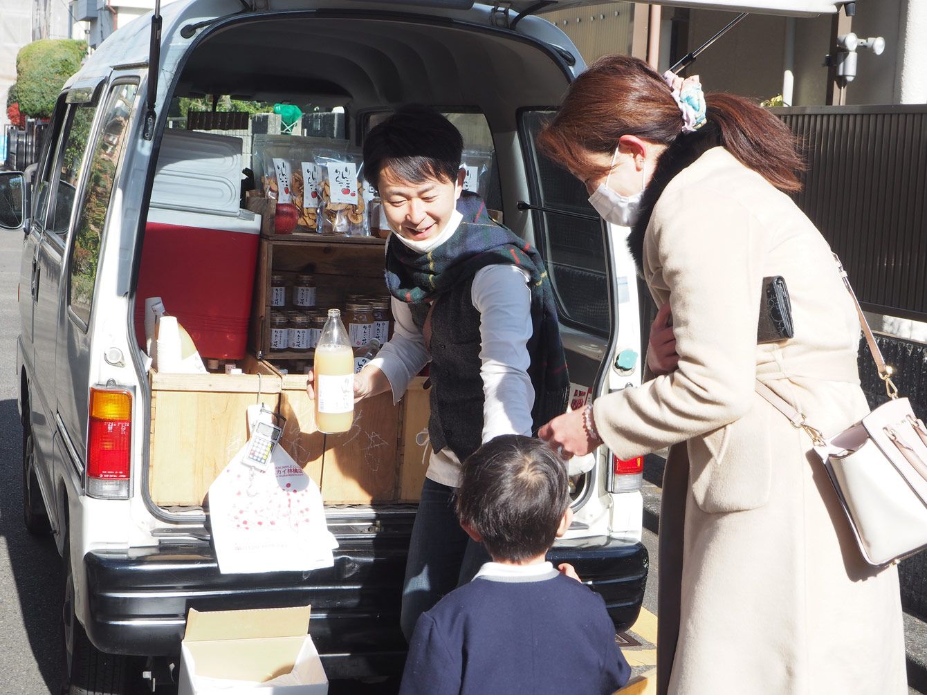 片山さんのバンに積まれた木箱に並ぶリンゴ、はちみつ、ジュース。