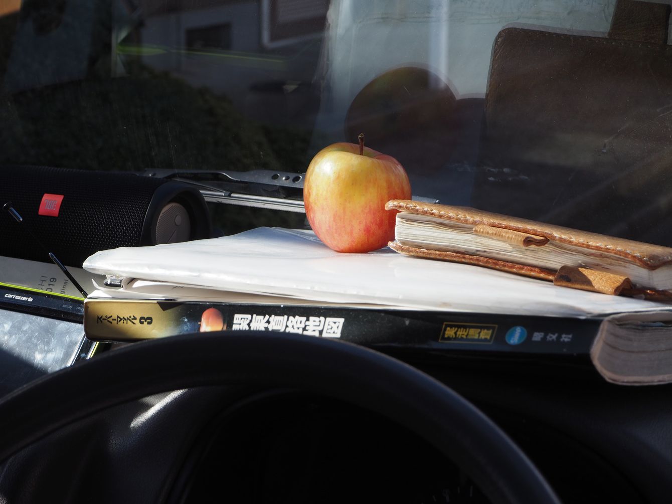 片山さんの軽バンの運転席に置かれたリンゴ。
