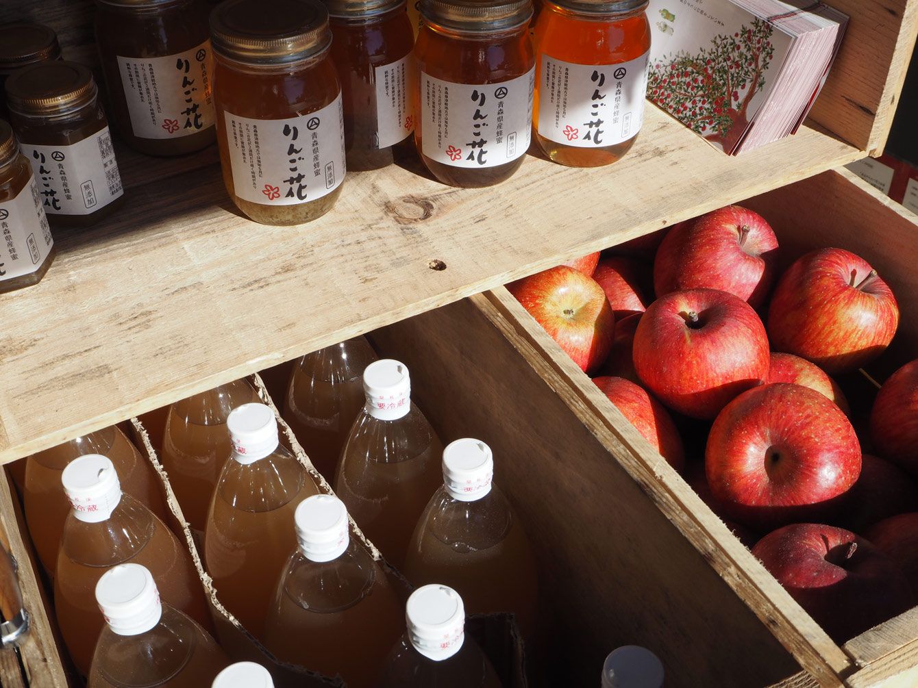 片山さんのバンに積まれた木箱に並ぶリンゴ、はちみつ、ジュース。