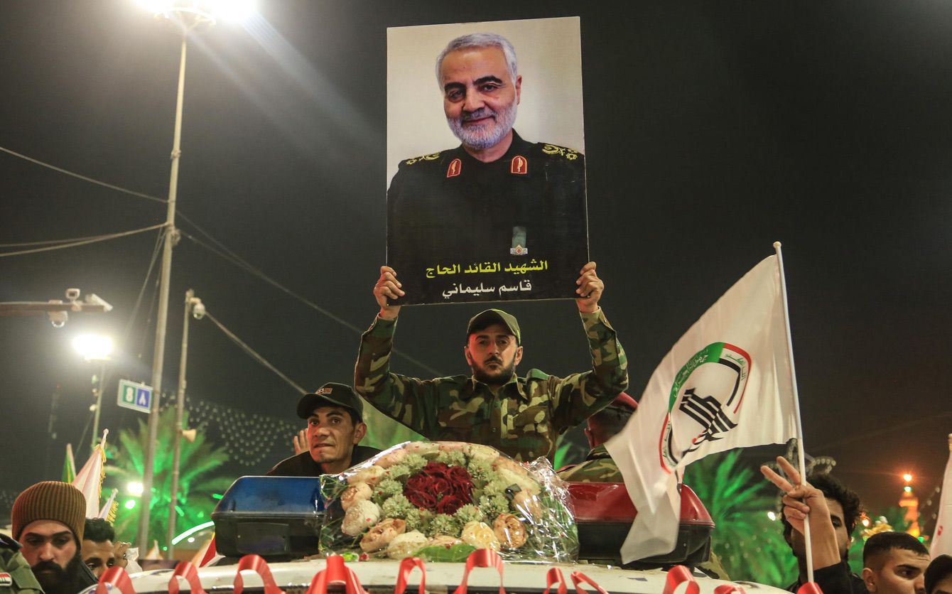 米軍の攻撃で殺害されたソレイマニ司令官の葬列に、遺影を掲げて参加する人々(イラク・中部カルバラ)=2020年1月4日