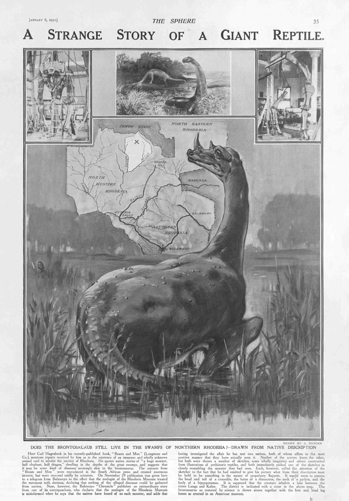 図版1:ハーゲンベック恐竜探検隊にかんする、「スフィア」紙(1910年1月8日)の記事('A Strange Story of a Giant Reptile.'Sphere.8 January 1910,35.)出所=『