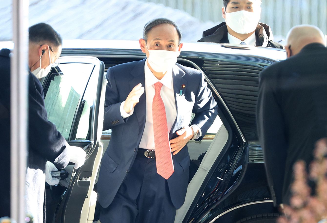 首相官邸に入る菅義偉首相=2021年1月20日、東京・永田町