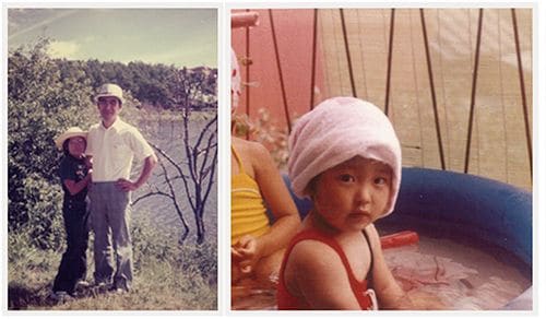 (左)大好きな父と。幼いころの写真はあまり残っていない。写真を撮ることも少なく、アルバムを整理する人もいなかったからだ。(右)幼稚園のプールで遊ぶ。