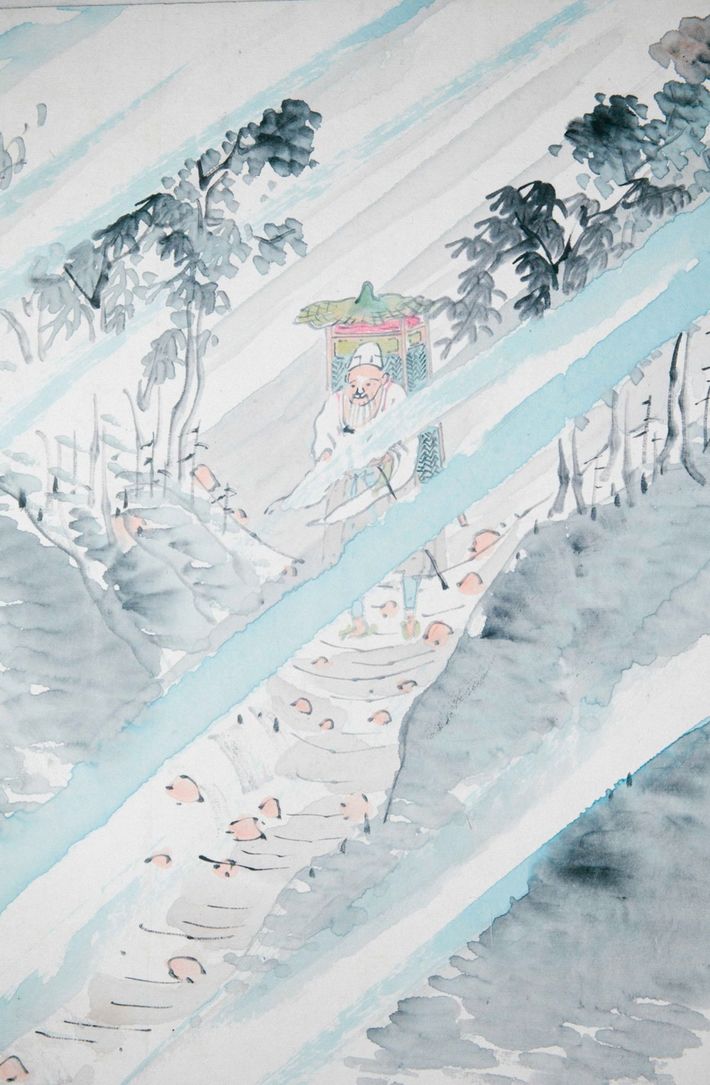 岩手県から国見峠を越えて秋田県に入る蓑虫山人。背中に背負った笈は庵に変形する(秋田県立博物館所蔵、撮影・田附勝)。