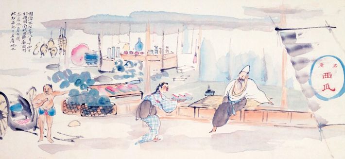 秋田での西瓜屋の図。このように、蓑虫山人は当時の庶民の生活をモチーフに多くの日記を残している。しかし、めちゃくちゃリラックスしている(秋田県立博物館所蔵、撮影・田附勝)。