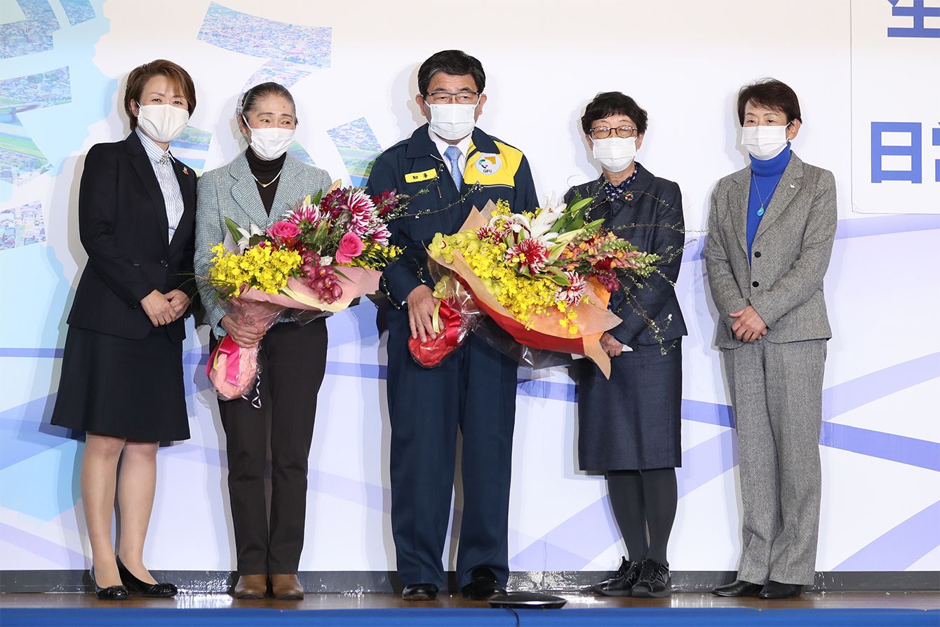 岐阜県知事選で勝利し、花束を手にする現職の古田肇氏(中央)=2021年1月24日、岐阜市