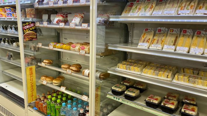 24時間営業のコンビニには軽食だけが並んでいた=1月27日午後10時半ごろ、神奈川県横浜市の東名高速上りの港北PA