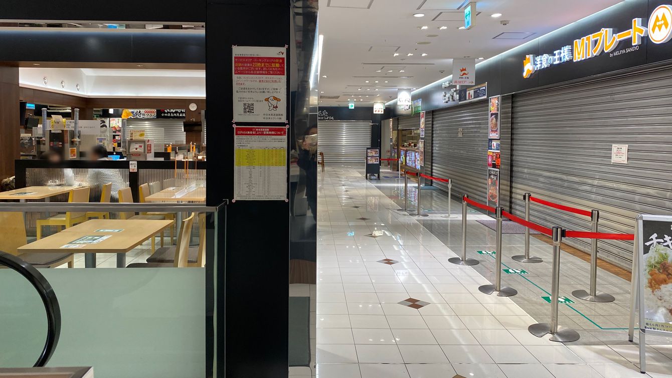 東名高速上りの海老名SA。24時間営業の店は20時に閉店したが、席は利用できる=1月27日午後9時ごろ、神奈川県海老名市