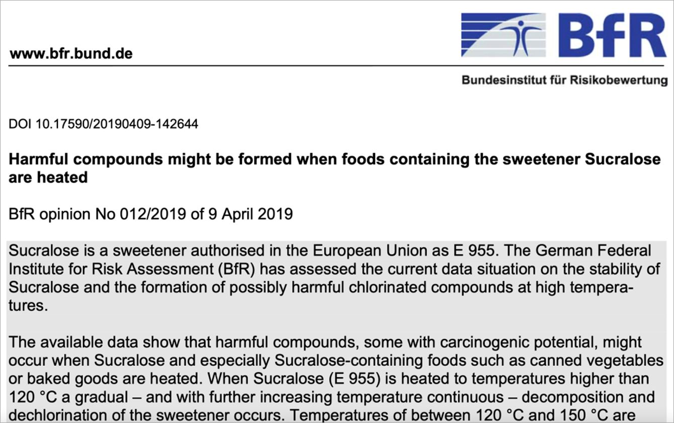 ドイツ連邦リスク評価研究所(BfR)のスクラロースに関する意見書。高温で加熱すると有害物質が発生するかもしれない、とする一方、十分なデータがないことも公表している。