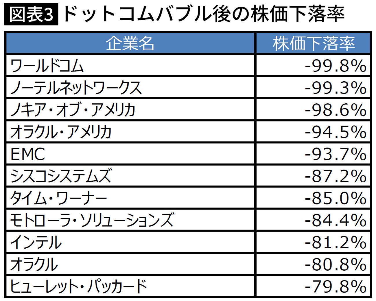 2000年3月22日~2002年10月9日までの株価下落率(配当調整済み)2000年当時の時価総額$100billion以上の企業を抽出