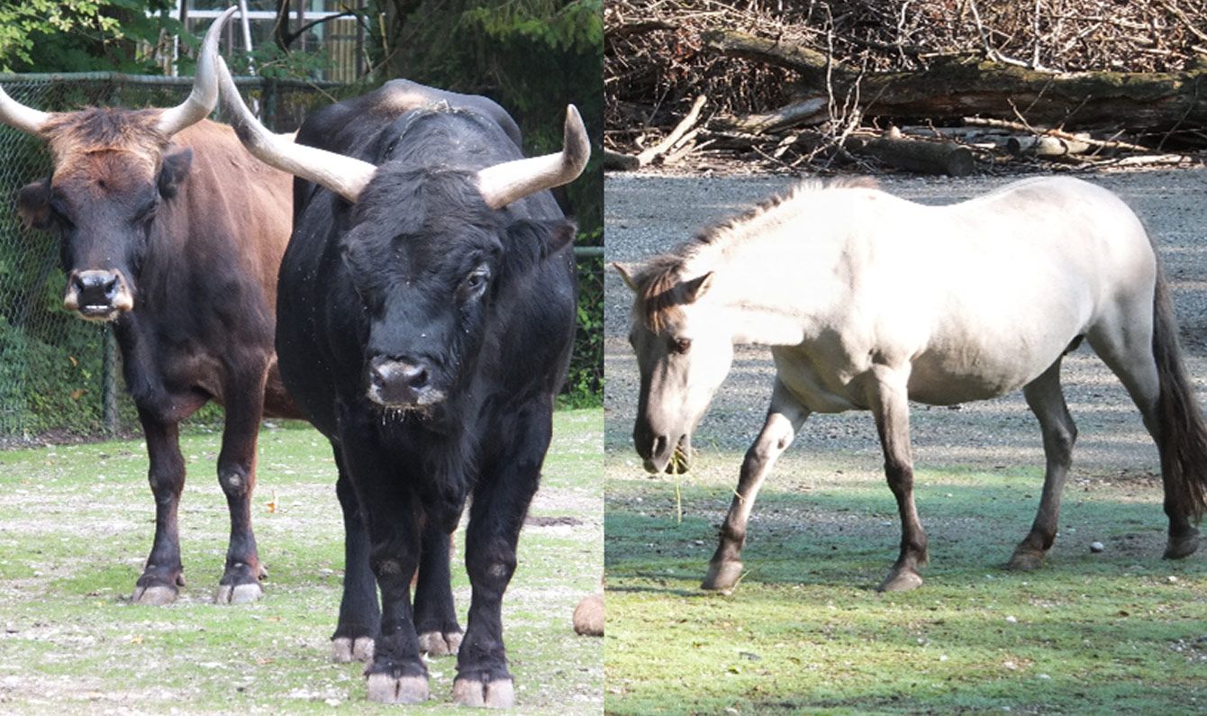 図版1:ミュンヘンのヘラブルン動物園で飼育されている「オーロックス」(左)と「ターパン」(右)(画像=『