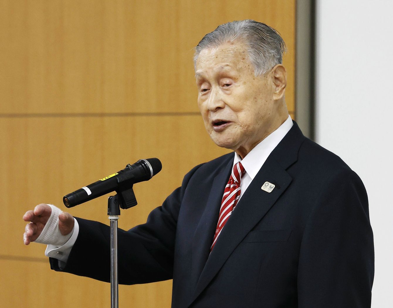日本オリンピック委員会の女性理事増員方針をめぐる発言について記者会見する東京五輪・パラリンピック組織委員会の森喜朗会長=2021年2月4日、東京都中央区[代表撮影]
