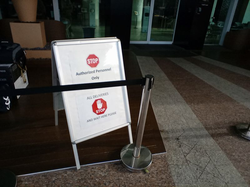 「許可された者のみ(入館可)。すべてのデリバリーの人はここで待つこと」の看板。晴れて「自由の身」になったときに撮影(写真提供=柳沢大河さん)