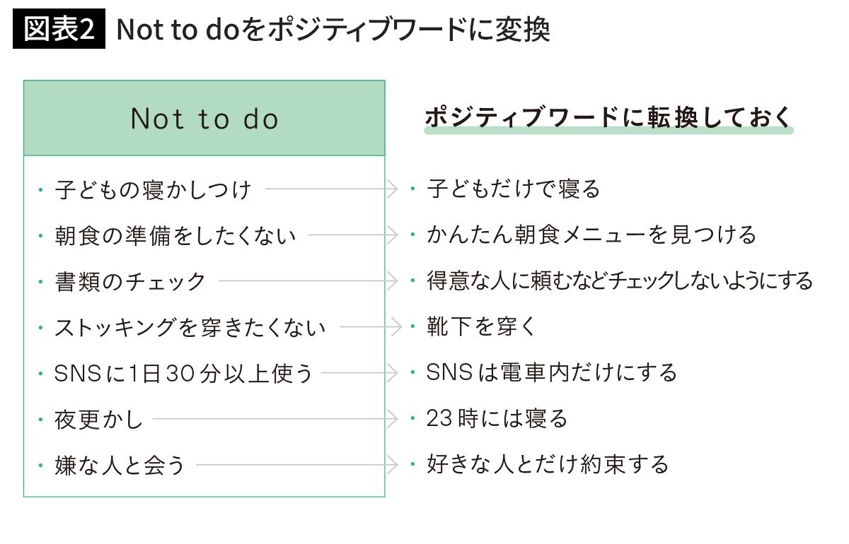 このように実際に書いて残しておくことが大切。to doではなく、Not to doリストを作りましょう。
