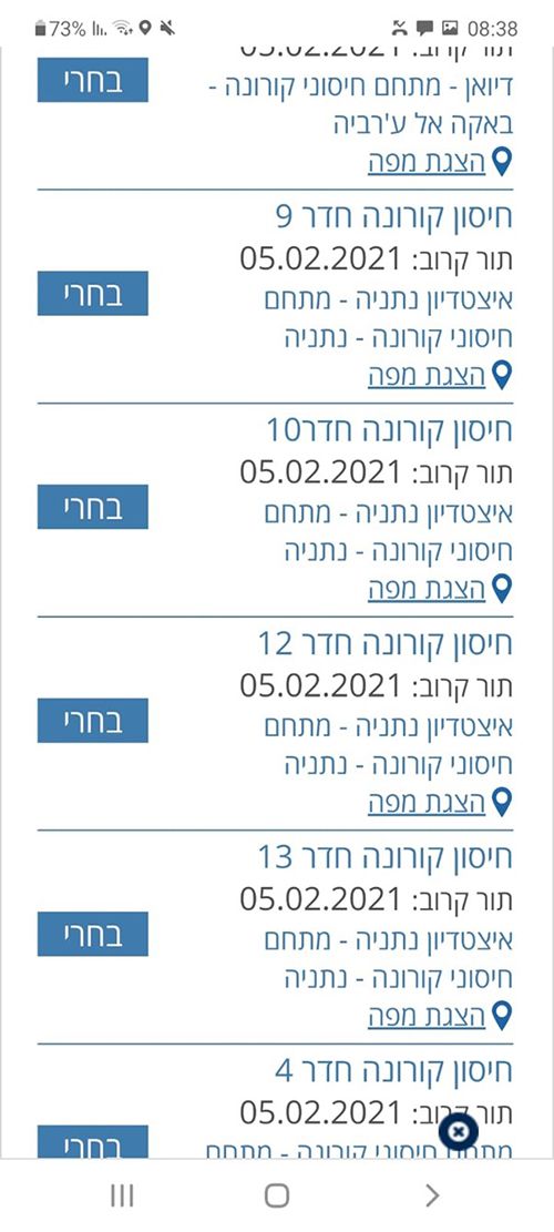 保健機構アプリのワクチン接種予約画面。空いている日時と場所が表示される(筆者提供)