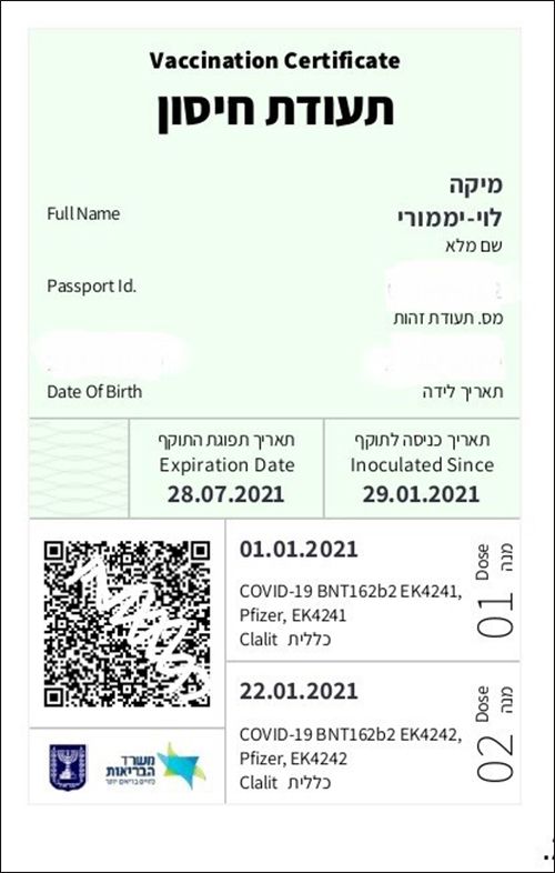 1週間後にダウンロード先リンクが送られて来た正式な接種済み証明。発行元は保健省で、「グリーンパスポート」と呼ばれている。紙の証明書はなく、電子ファイルのみ。有効期限は2回目の接種から6カ月と1週間後(筆者提供)
