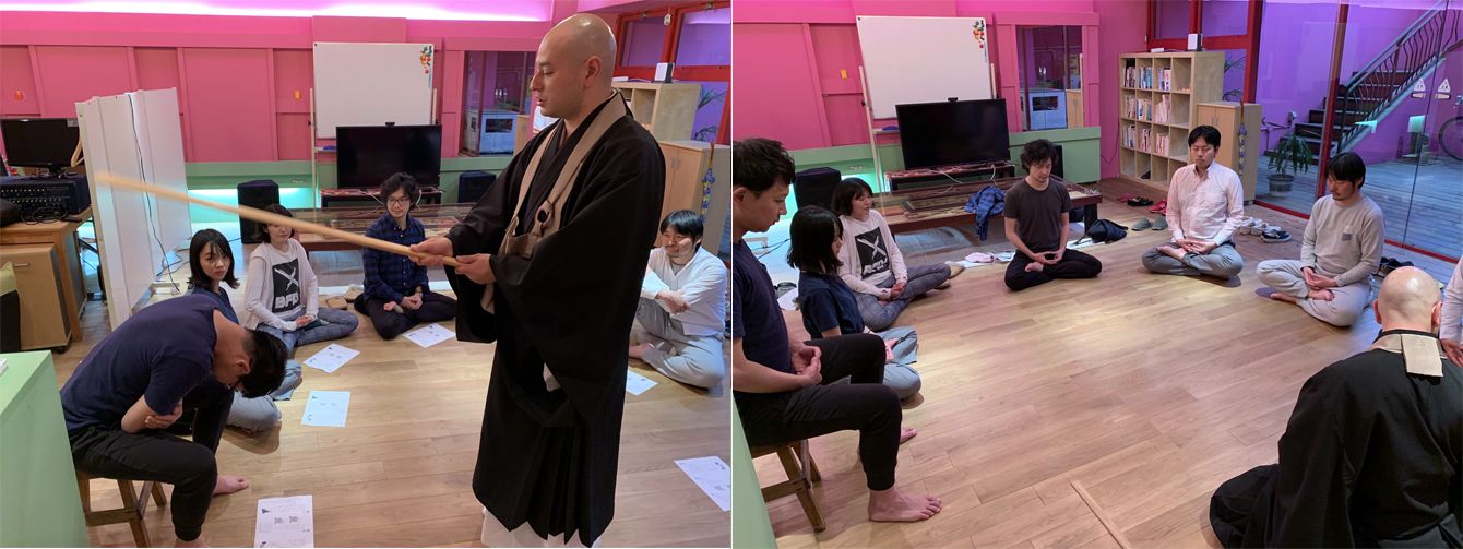 出張坐禅の風景。鎌倉のウェブ制作会社村式のオフィスにて坐禅指導する岩山さん。