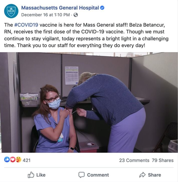 マサチューセッツ総合病院で職員の接種が始まったことを知らせるFBページ。