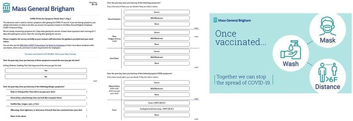 (左)接種終了後、3日間毎日副反応をチェックするメールが来て、アプリで返答するようになっている。/(右)接種が終わっても、感染対策を怠らないように指導がある
