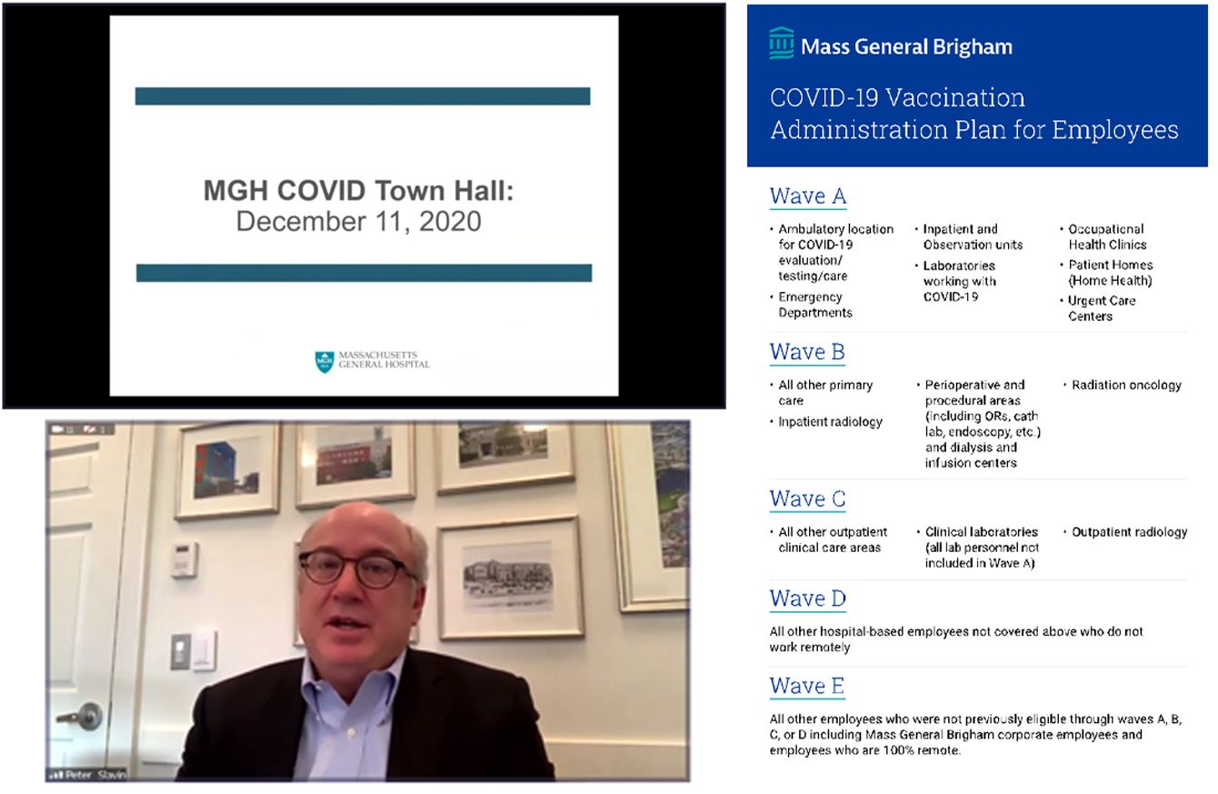 写真(左):対話集会では、質問があればチャット機能やメールなどで質問することができる(以下、MGH Public Affairの許可を得て掲載)(右)職員を5つのウエーブに分け、順番に接種していく