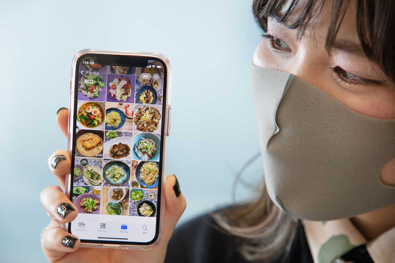 編集部員のスマホのアルバム。色鮮やかな料理の写真が記録されている。