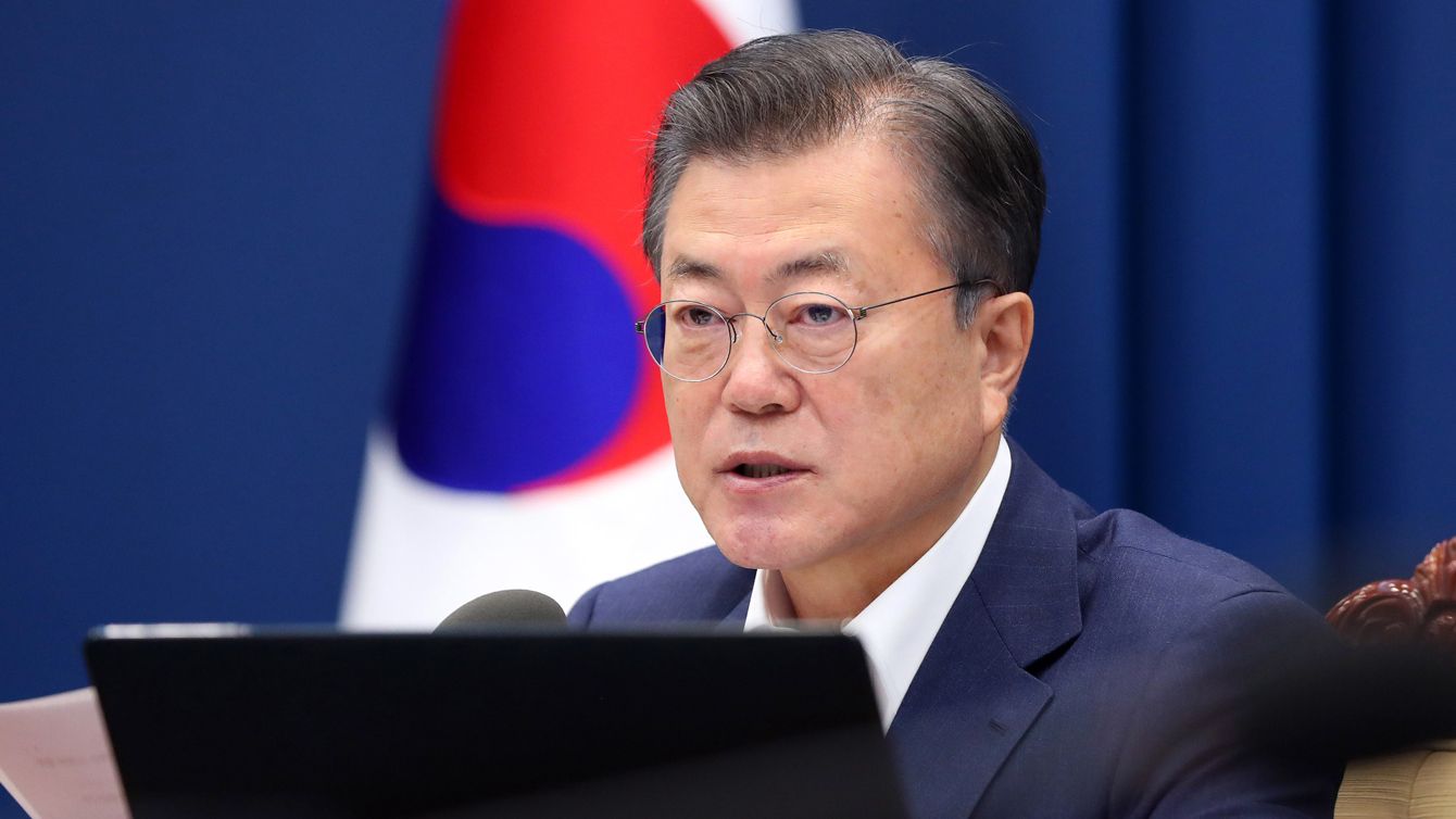 2021年2月16日、ソウル大統領府での閣議で発言する韓国の文在寅(ムン・ジェイン)大統領