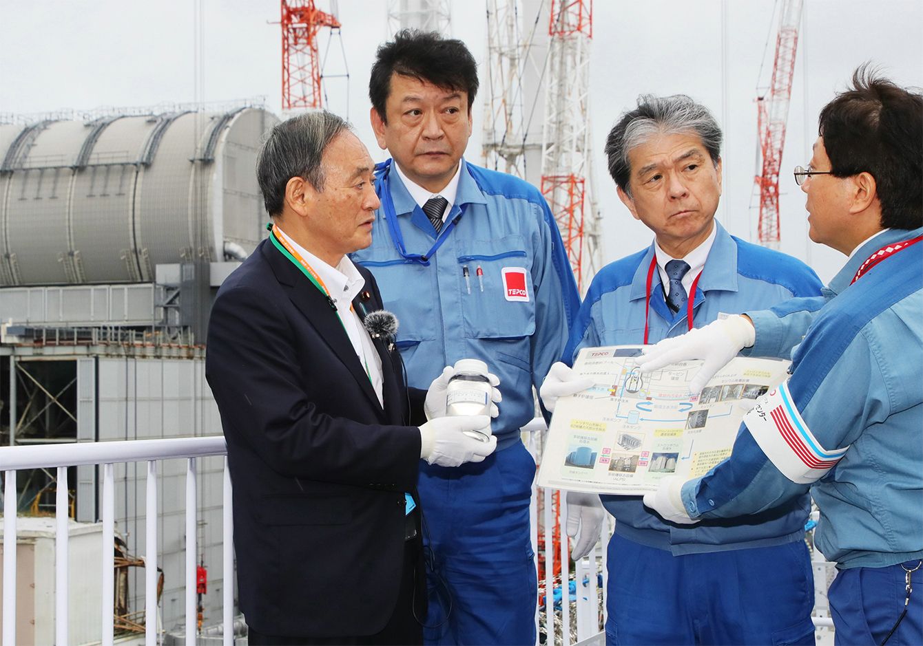 東京電力の福島第1原子力発電所構内を視察し、多核種除去設備(ALPS)で浄化処理した汚染水を手にする菅首相。右隣は東京電力HDの小早川社長と小野明・福島第1廃炉推進カンパニー・プレジデント。奥左は3号機=2020年9月26日、福島県大熊町[代表撮影]