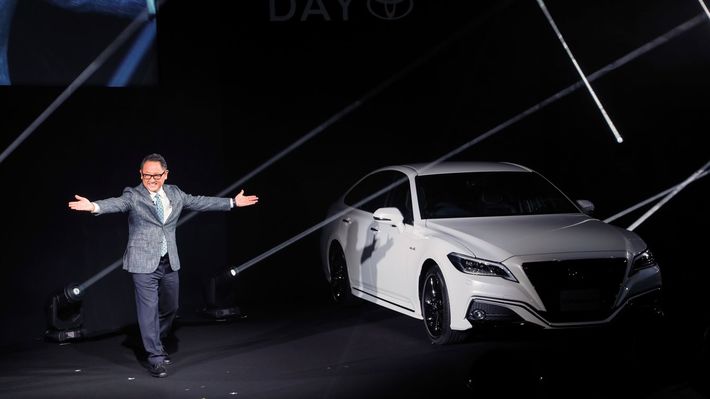 2018年6月26日、東京都内で開催されたコネクテッドカーを紹介するイベントで、オールニューデザインのフラッグシップセダン「トヨタ クラウン」を発表する豊田章男社長。