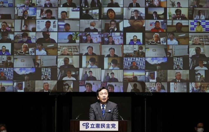 オンラインで開かれた立憲民主党の定期党大会であいさつする枝野幸男代表=2021年1月31日、東京都内のホテル[代表撮影]