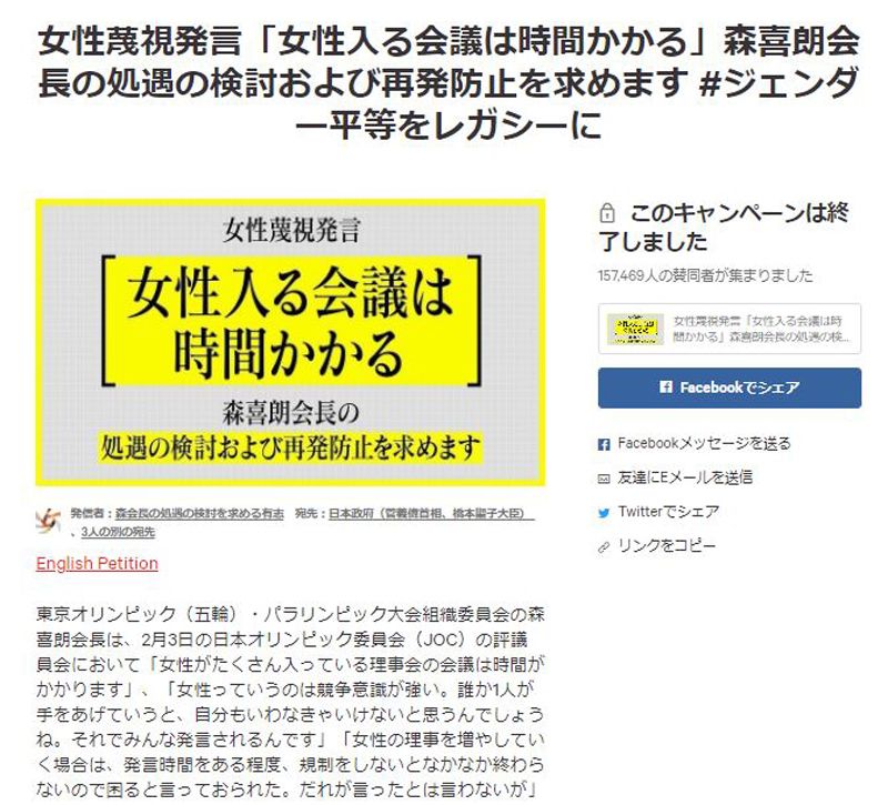 森前会長の発言に抗議するオンライン署名は、15万筆以上を集めた(change.orgより)