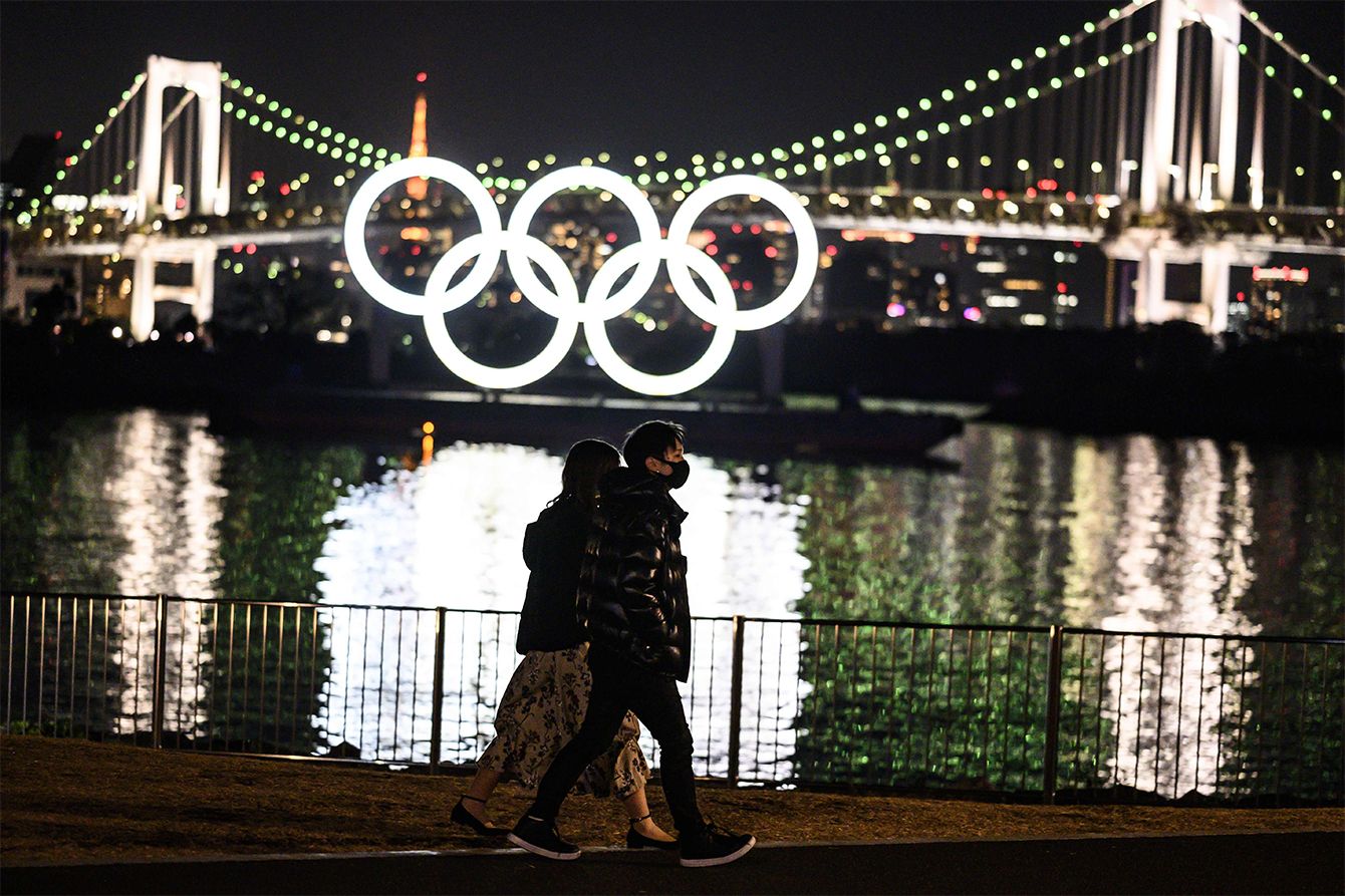 東京のお台場ウォーターフロントでオリンピックリングの前を歩く人々=2021年2月6日