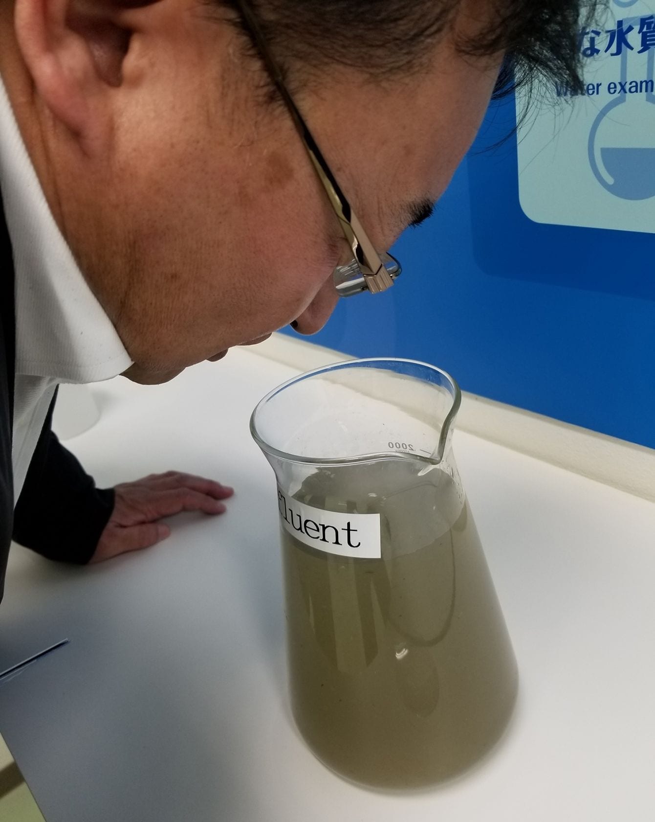 下水処理場に到着したばかりの下水を嗅ぐ筆者(神舘)