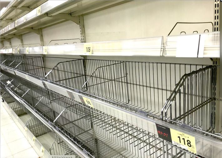 空になったスーパーの食品棚(2020年3月26日撮影)