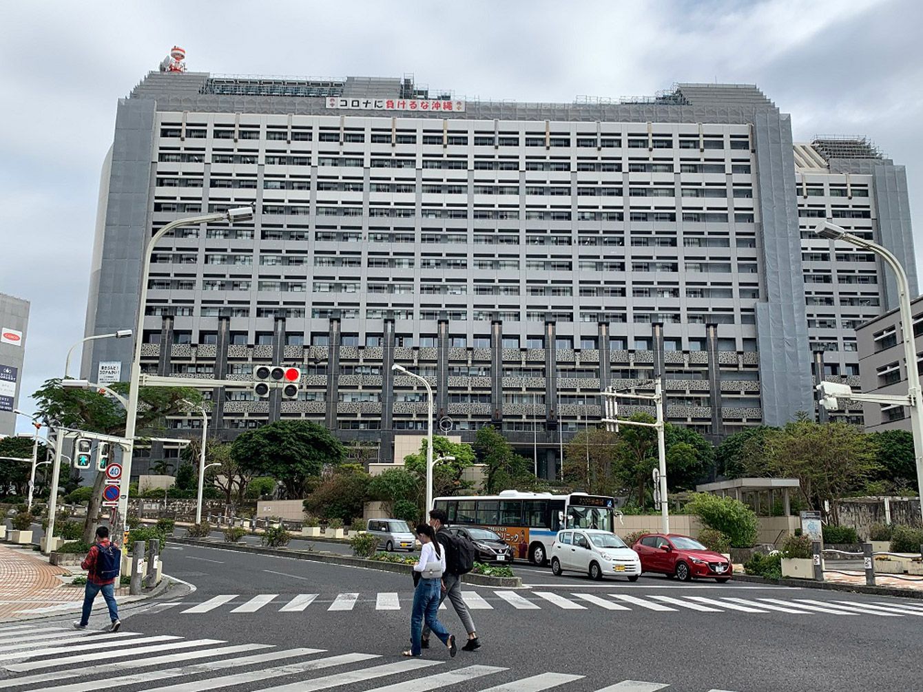 沖縄県独自の緊急事態宣言最終日に行き交う人もまばらな沖縄県庁前の交差点=2月28日、那覇市。