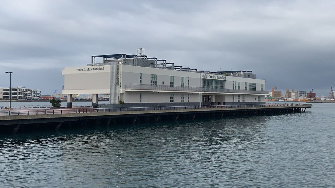 豪華客船が消え、ドライブスルー方式のPCR検査場になっている那覇クルーズターミナル=2月28日、那覇市。