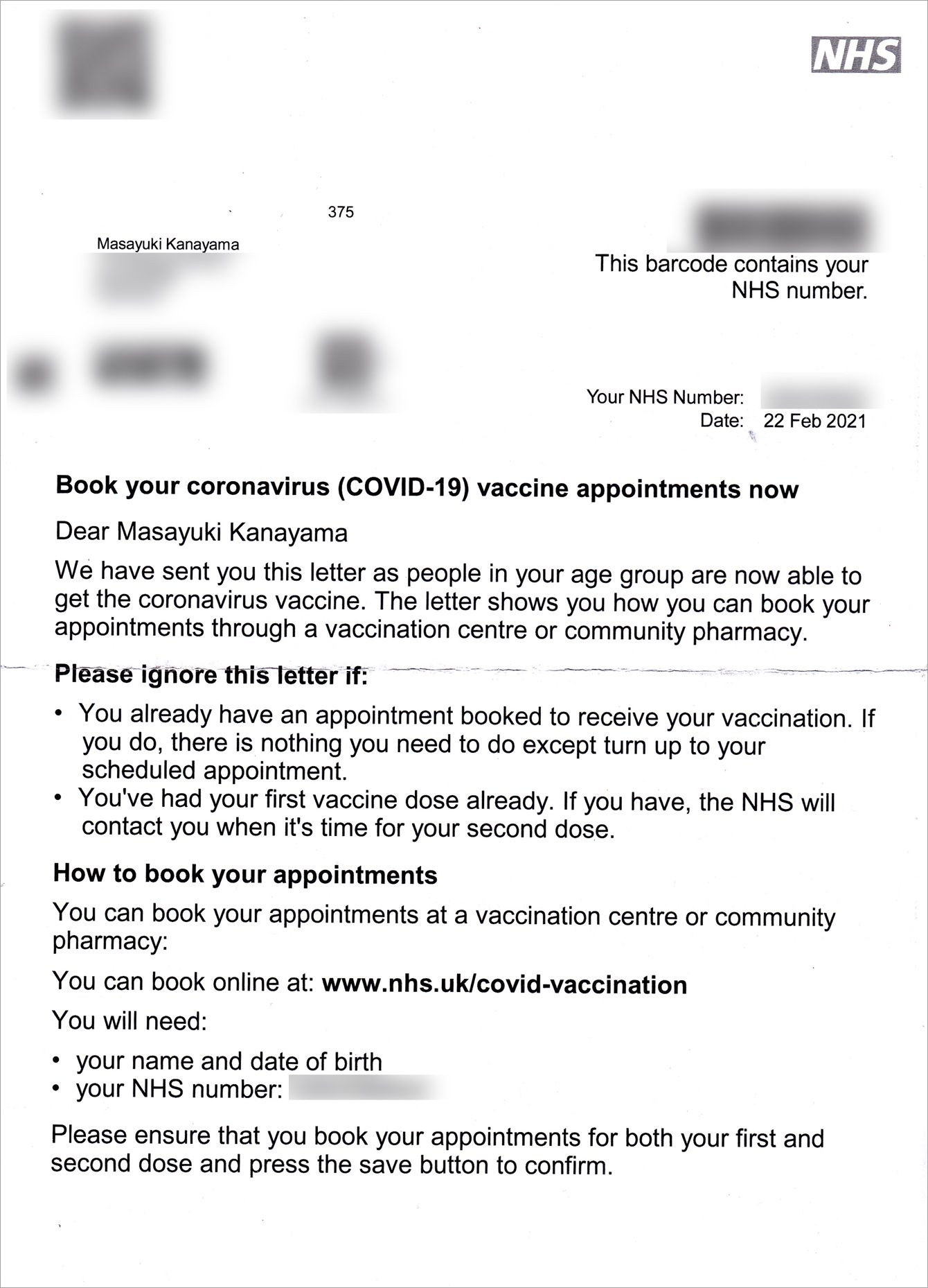 NHS(国営医療サービス)から届いた接種の案内状