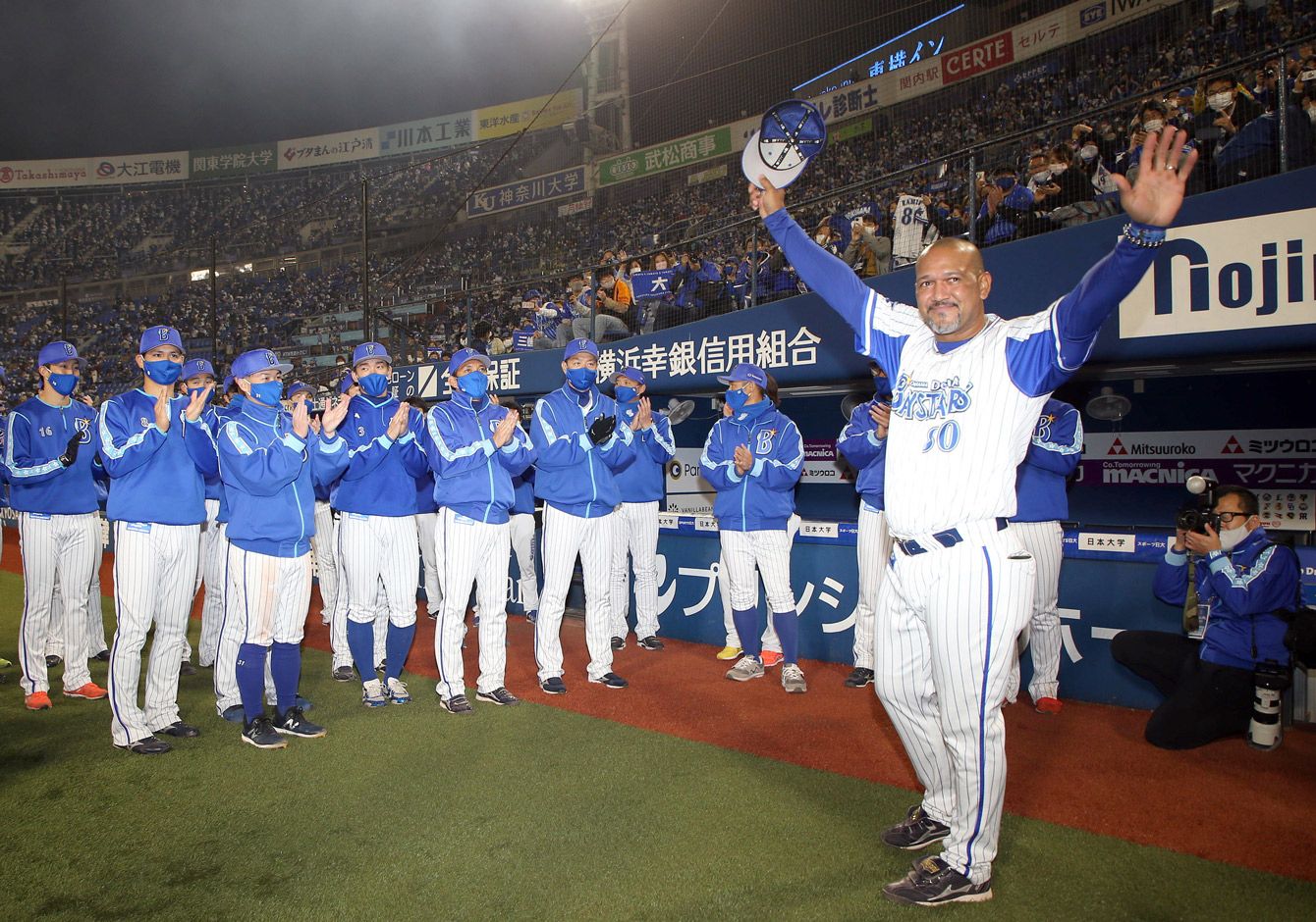 DeNAの監督退任が決まり、最終戦後にファンに手を振るアレックス・ラミレスさん(右手前)=2020年11月14日、横浜スタジアム