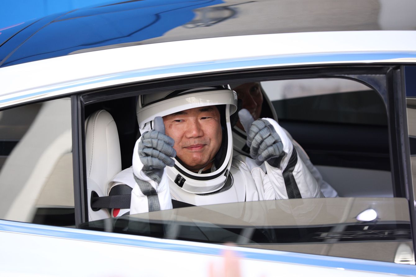 2020年11月15日、発射台に向かう前に、見送りの人たちに応えポーズを取る野口聡一さん(アメリカ・フロリダ州ケネディ宇宙センター)