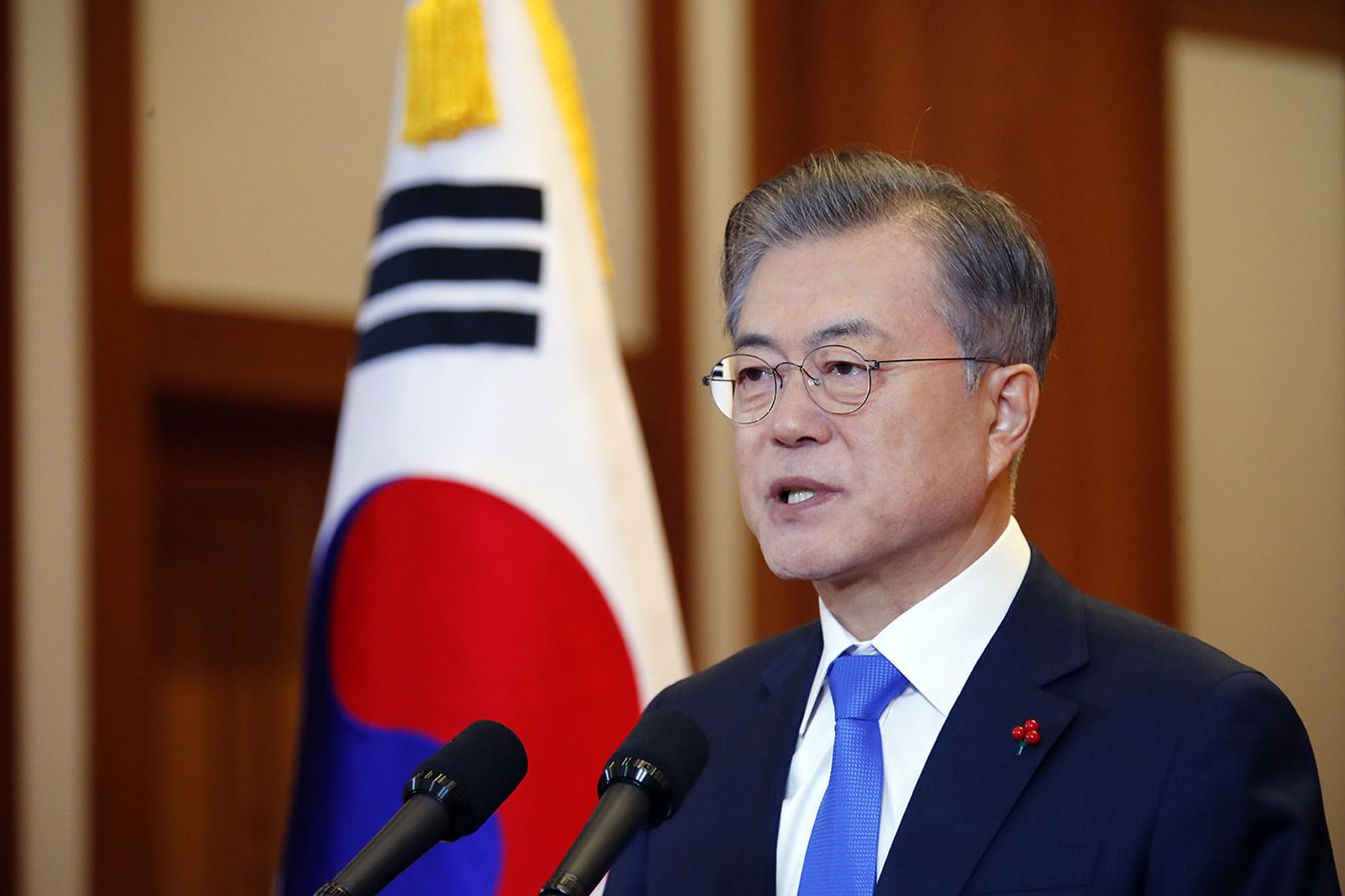 ソウルの青瓦台(大統領府)で、年頭記者会見を行う文在寅大統領=2019年1月10日、韓国・ソウル