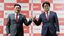 資本提携で合意し、ボード越しにこぶしを合わせる日本郵政の増田寛也社長(右)と楽天の三木谷浩史会長兼社長=2021年3月12日、東京・大手町