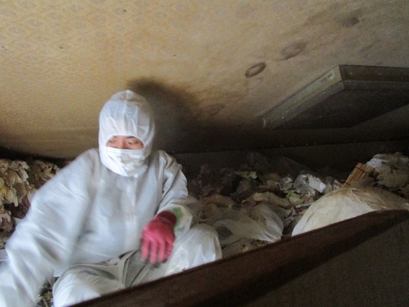 ゴミが天井近くまで積み上がっている作業現場。1DKで60代女性が住んでいた。
